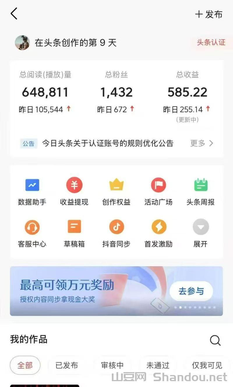 正文 今日头条零撸平台免费提供视频 秒到网 V管理员 /01-21/53阅读/0评论 0121 只限安卓今日头条零撸平台免费提供视频,大家记得坚持发视频,平台免费提供视频你只需要把视频保存下来发到头条即可,55分成,保存图片微信扫码注册填写邀请码6573然后去授权头条号,完了领视频发布就行,推广好友来发还能赚佣金无限代提成